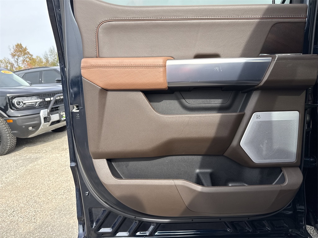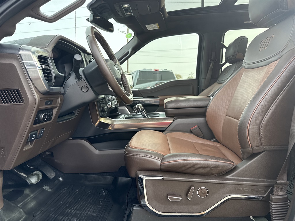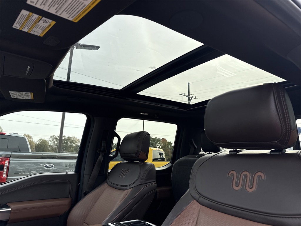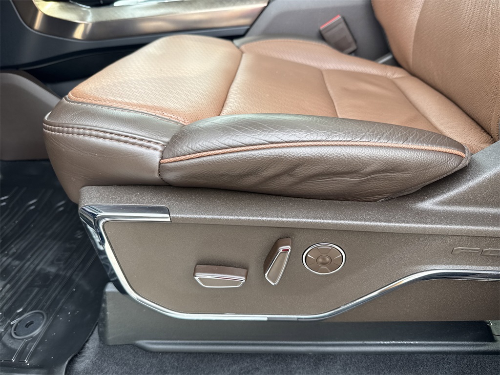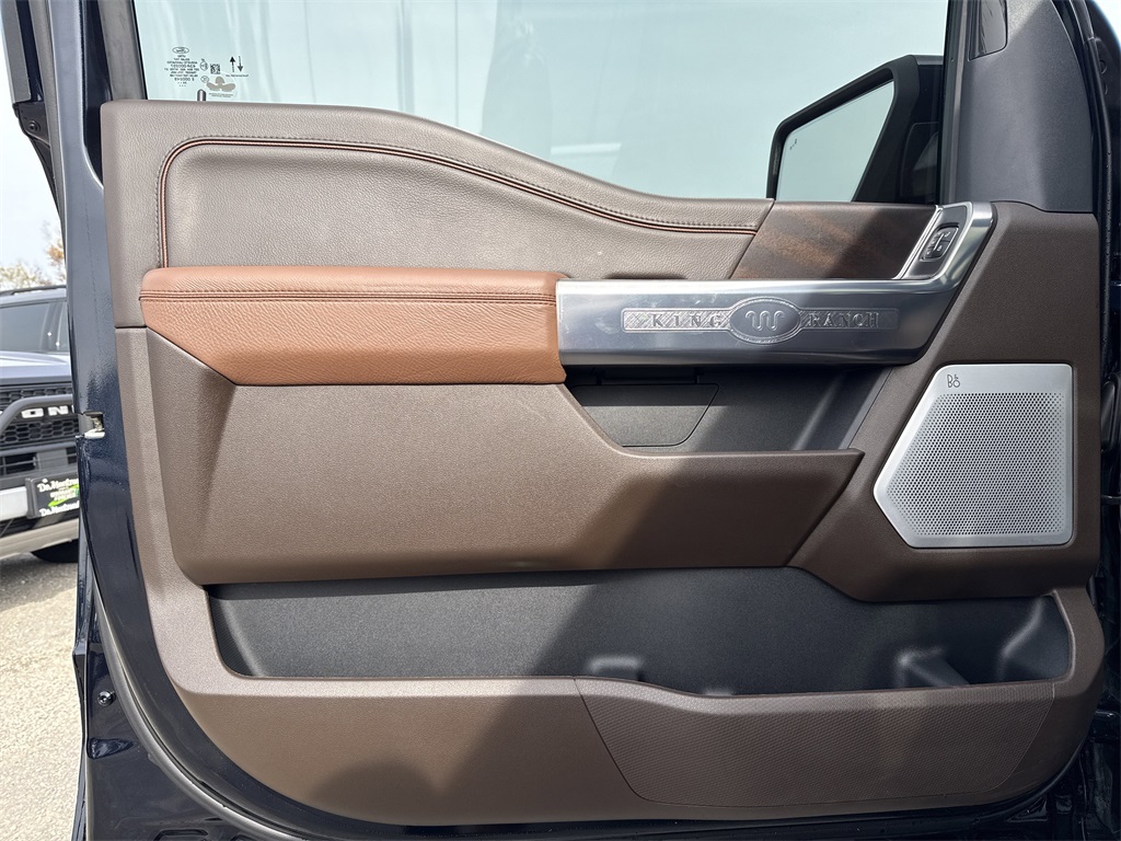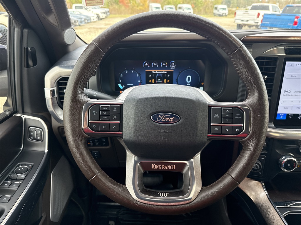 o-dimming door mirrors, Auto-dimming Rear-View mirror, Automatic temperature control, Brake assist, Chrome wheels, Compass, Delay-off headlights, Driver door bin, Driver vanity mirror, Dual front impact airbags, Dual front side impact airbags, Electronic Stability Control, Emergency communication system: SYNC 4 911 Assist, Front anti-roll bar, Front Bucket Seats, Front Center Armrest, Front dual zone A/C, Front fog lights, Front License Plate Bracket, Front reading lights, Front wheel independent suspension, Fully automatic headlights, Garage door transmitter, Genuine wood dashboard insert, Heads-Up Display, Heated door mirrors, Heated front seats, Heated rear seats, Heated steering wheel, Illuminated entry, Internet access capable: FordPass Connect 5G, King Ranch Multicontour Leather Bucket Seats, Leather steering wheel, Low tire pressure warning, Memory seat, Navigation system: Connected Navigation, Occupant sensing airbag, Outside temperature display, Overhead airbag, Overhead console, Panic alarm, Passenger door bin, Passenger vanity mirror, Pedal memory, Power door mirrors, Power driver seat, Power moonroof, Power passenger seat, Power steering, Power windows, Radio data system, Radio: B&O Unleashed Sound System by Bang & Olufsen, Rain sensing wipers, Rear reading lights, Rear seat center armrest, Rear step bumper, Rear window defroster, Remote keyless entry, Retractable Rear Center Step, Security system, Speed control, Split folding rear seat, Steering wheel memory, Steering wheel mounted audio controls, SYNC 4 w/Enhanced Voice Recognition, Tachometer, Telescoping steering wheel, Tilt steering wheel, Traction control, Trip computer, Turn signal indicator mirrors, Variably intermittent wipers, Ventilated front seats, Voltmeter, Wheel Well Liner, and Wheels: 20" Chrome-Like PVD.