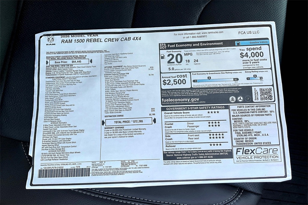Granite Crystal Metallic Clearcoat 2026 Ram 1500 Rebel 4WD 8-Speed Automatic 3.0L I6 Prices do not include Tax, Title, License and Documentary Fee. Price does include: $3500 - 2026 National Retail Consumer Cash . Exp. 01/05/2026