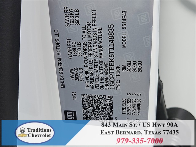 heels, AM/FM radio: SiriusXM with 360L, Apple CarPlay/Android Auto, Auto High-beam Headlights, Automatic Emergency Braking, Automatic temperature control, Black Spray-on Bedliner with Chevrolet Logo, Brake assist, Chevy Safety Assist, Cloth Seat Trim, Compass, Delay-off headlights, Driver door bin, Driver vanity mirror, Dual front impact airbags, Dual front side impact airbags, Electronic Stability Control, Emergency communication system: OnStar, Following Distance Indicator, Forward Collision Alert, Front anti-roll bar, Front Bucket Seats, Front Center Armrest, Front dual zone A/C, Front Pedestrian and Bicyclist Braking, Front wheel independent suspension, Heated door mirrors, Illuminated entry, IntelliBeam Automatic High Beam on/Off, Lane Keep Assist with Lane Departure Warning, Low tire pressure warning, Navigation System, Occupant sensing airbag, Outside temperature display, Overhead airbag, Overhead console, Panic alarm, Passenger door bin, Passenger vanity mirror, Power door mirrors, Power steering, Power windows, Radio data system, Radio: 11.3" Diagonal Advanced Color LCD Display, Rear reading lights, Rear step bumper, Rear window defroster, Remote keyless entry, Security system, SiriusXM with 360L Trial Subscription, Speed control, Speed-sensing steering, Split folding rear seat, Steering Wheel Mounted Audio Controls, Steering wheel mounted audio controls, Tachometer, Tilt steering wheel, Traction control, Trip computer, Variably intermittent wipers, Wheels: 18" x 8.5" Black High Gloss Aluminum, Wheels: 20" x 9" High Gloss Black Aluminum, and Wireless Phone Projection. Tax, title, license and dealer fees (unless itemized above) are extra. Not available with special finance or lease offers. See Dealer for Details. Price includes: $500 - Customer Cash. Exp. 01/02/2026