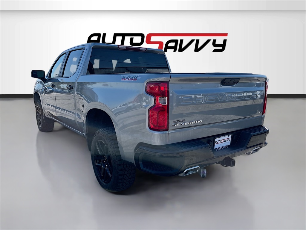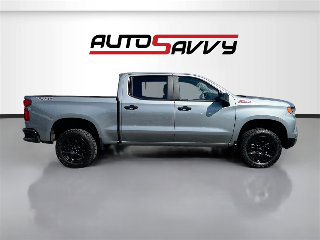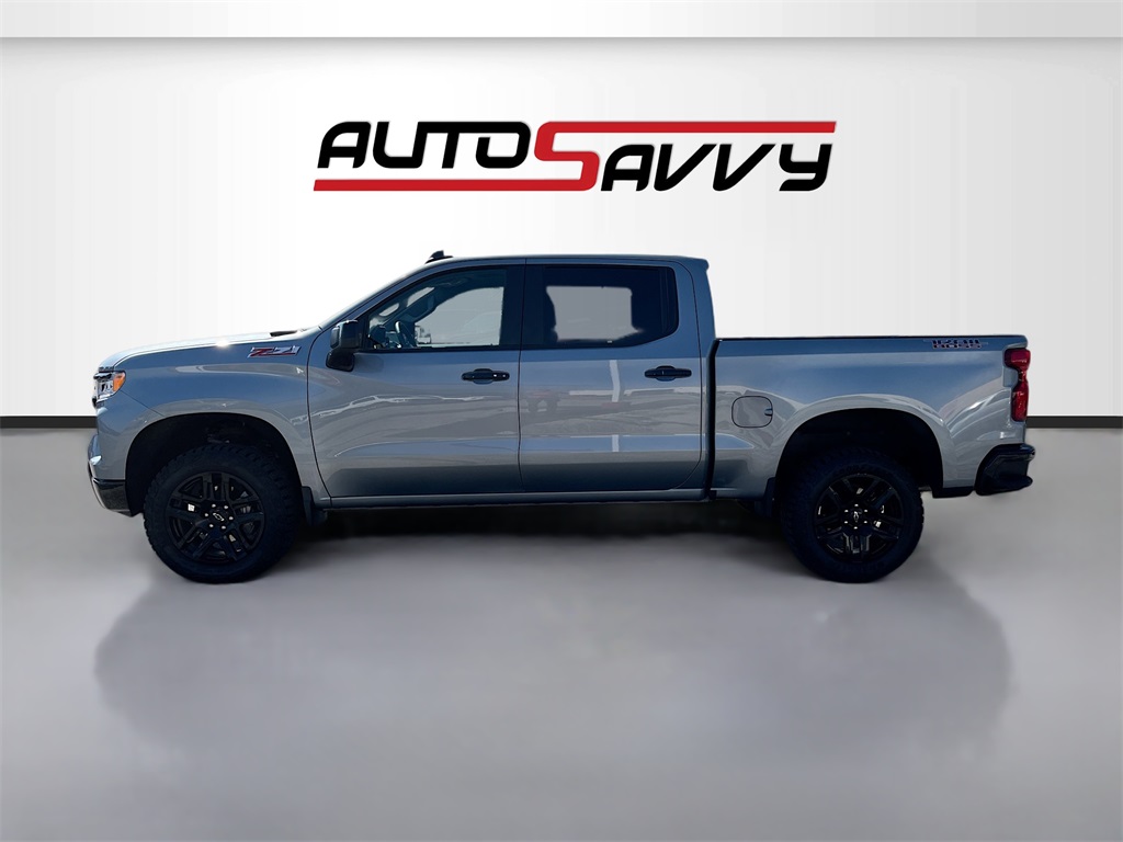 Discover the 2025 Chevrolet Silverado 1500 4WD Crew Cab LT Trail Boss, now available at AutoSavvy Houston Southwest. This rugged pickup, finished in a striking Sterling Gray Metallic, is powered by a robust EcoTec3 5.3L V-8 engine, delivering an impressive 355 horsepower. With a low mileage of just 3,925, it promises a near-new driving experience. The LT Trail Boss trim is equipped with premium features such as a 10-speed automatic transmission, 20-inch high gloss black aluminum wheels, and an a