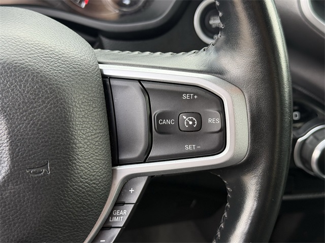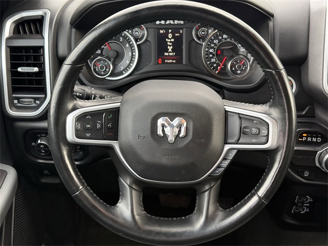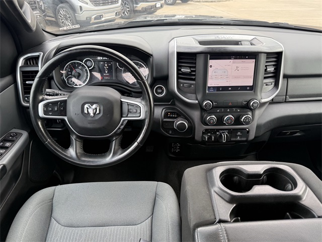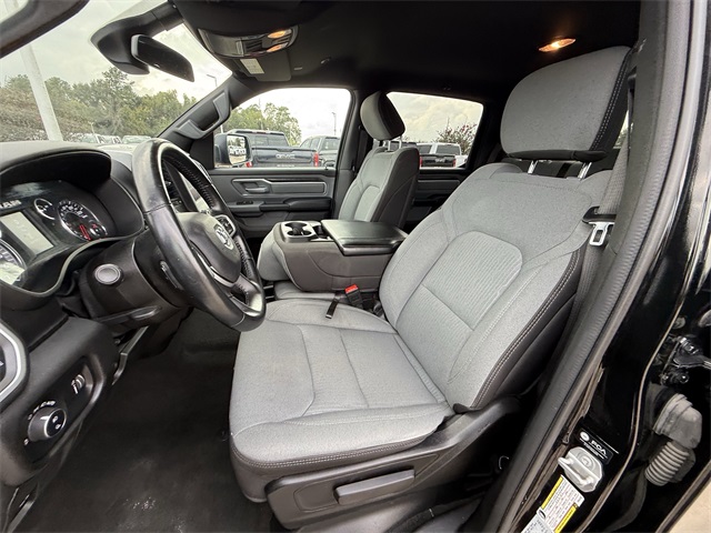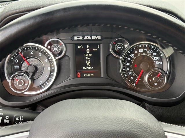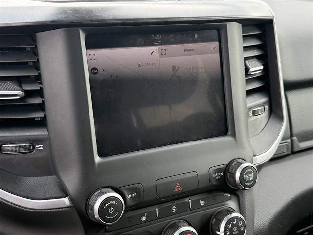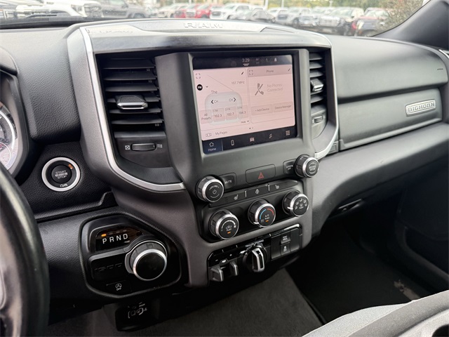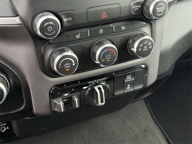 up, Black Exterior Mirrors, Black Premium Power Mirrors, Black Trailer Tow Power Mirrors, Black Trailer Tow Power Mirrors (DISC), Bluetooth Handsfree Phone & Audio, Brake assist, Bumpers: chrome, Class IV Receiver Hitch, Cloth Bench Seat, Connectivity - US/Canada, Convex Wide-Angle Exterior Mirror Insert, Delay-off headlights, Dual front impact airbags, Dual front side impact airbags, Electronic Stability Control, Emergency communication system: SiriusXM Guardian, Exterior Mirrors Courtesy Lamps, Exterior Mirrors w/Heating Element, Exterior Mirrors w/Supplemental Signals, Exterior Parking Camera Rear, For Details, Visit DriveUconnect.com, For More Info, Call 800-643-2112, Front anti-roll bar, Front Center Armrest w/Storage, Front Fog Lamps, Front reading lights, Front Seat Back Map Pockets, Front wheel independent suspension, Fully automatic headlights, Global Telematics Box Module (TBM), Glove Box Lamp, Google Android Auto, GPS Antenna Input, Heated door mirrors, Heated Front Seats, Heated Steering Wheel, Illuminated entry, Integrated Center Stack Radio, Integrated Voice Command w/Bluetooth, Low tire pressure warning, MOPAR 4 Adjustable Cargo Tie-Down Hooks, MOPAR Deployable Bed Step, MOPAR Spray In Bedliner, Occupant sensing airbag, Outside temperature display, Overhead airbag, Overhead console, Panic alarm, Passenger door bin, Passenger Sun Visor w/Illuminated Mirror, Pick-Up Box Lighting, Power door mirrors, Power-Folding Mirrors, Quick Order Package 27Z Big Horn, Radio: Uconnect 5 W w/8.4" Display, Rear 60/40 Folding Seat, Rear anti-roll bar, Rear Dome w/On/Off Switch Lamp, Rear Power Sliding Window, Rear seat center armrest, Rear step bumper, Rear Window Defroster, Remote keyless entry, SiriusXM Satellite Radio, Speed control, Split folding rear seat, Steering wheel mounted audio controls, Tachometer, Telescoping steering wheel, Tilt steering wheel, Traction control, Trailer Brake Control, Trailer Light Check, Trailer Reverse Steering Control, Trailer Tire Pressure Monitoring System, Trailer Tow Group, Trailer Tow Mirrors, Trip computer, USB Host Flip, Variably intermittent wipers, Voltmeter, Wheel to Wheel Side Steps, Wheels: 18" x 8" Cast-Aluminum Painted. CARFAX One-Owner. Priced below KBB Fair Purchase Price!